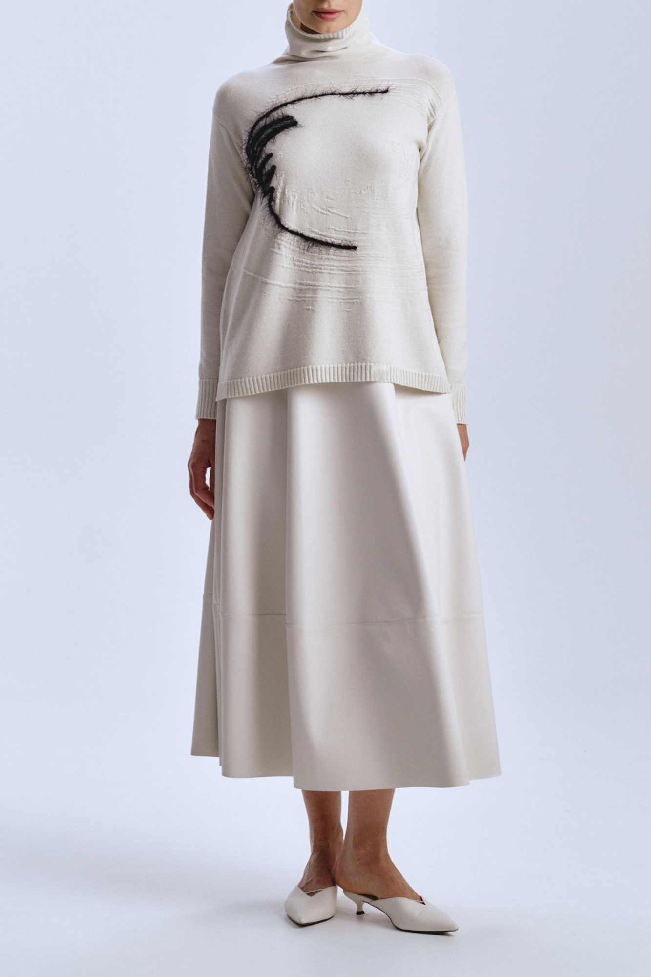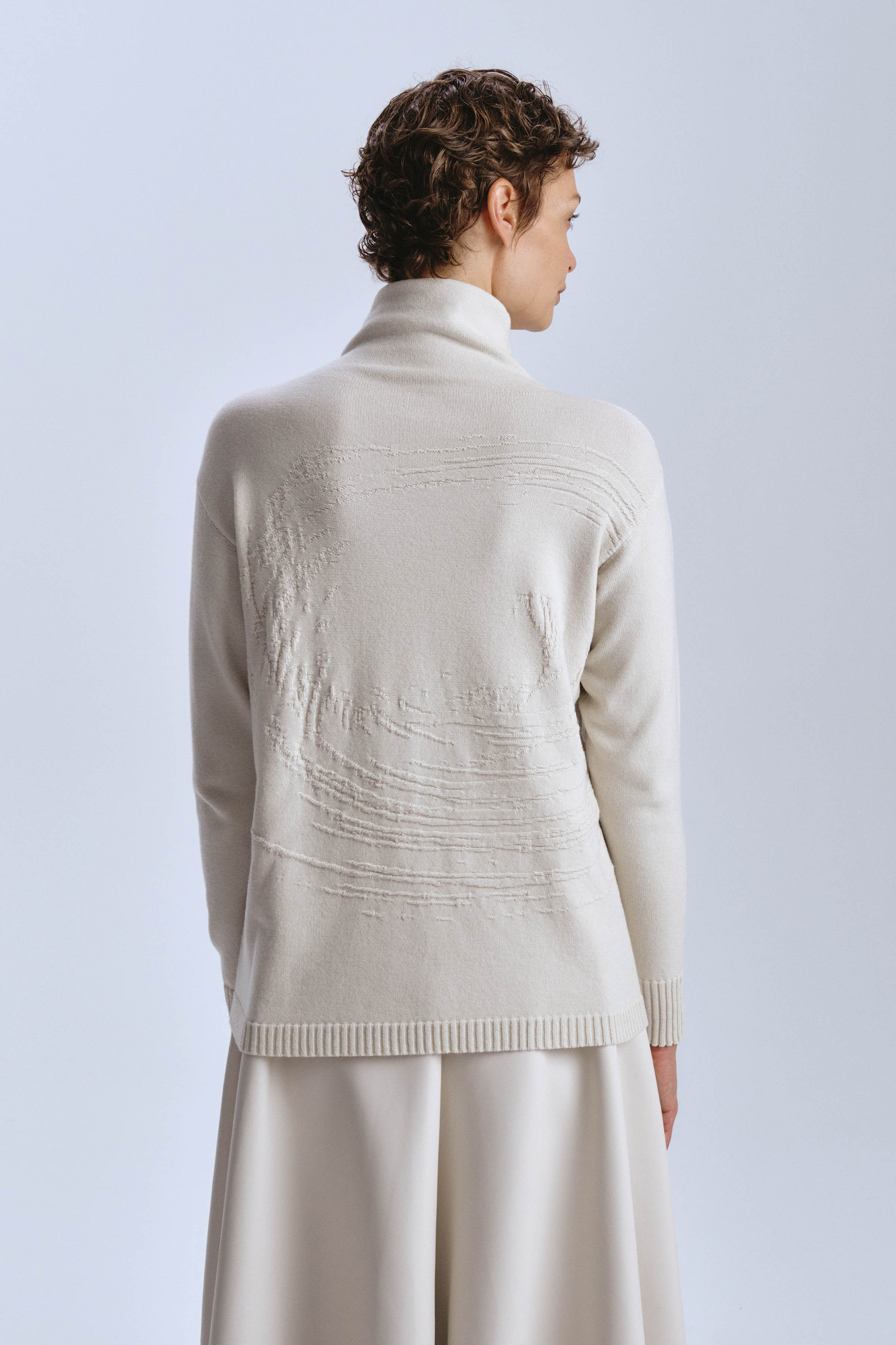 Вязаный джемпер водолазка полуприлегающего силуэта с длинным рукавом и горловиной стойкой. С фактурным рисунком по стану изделия и с декором из пушистой пряжи.