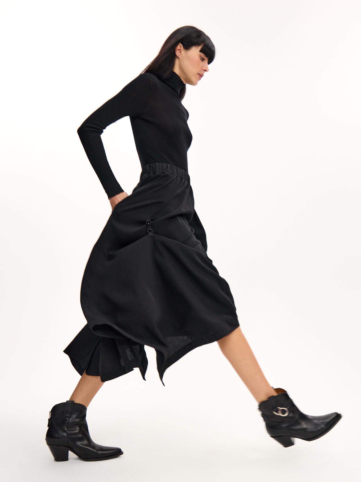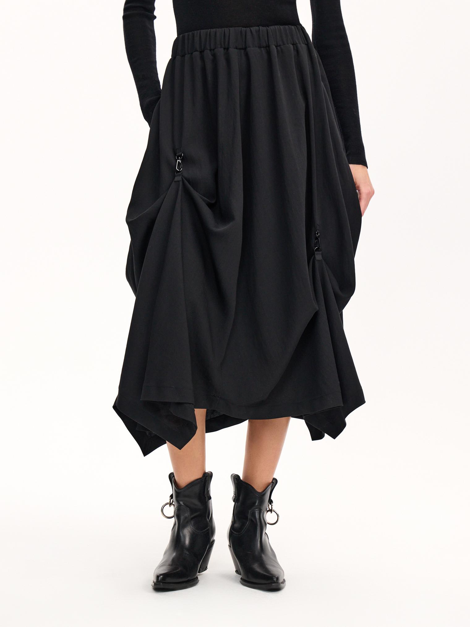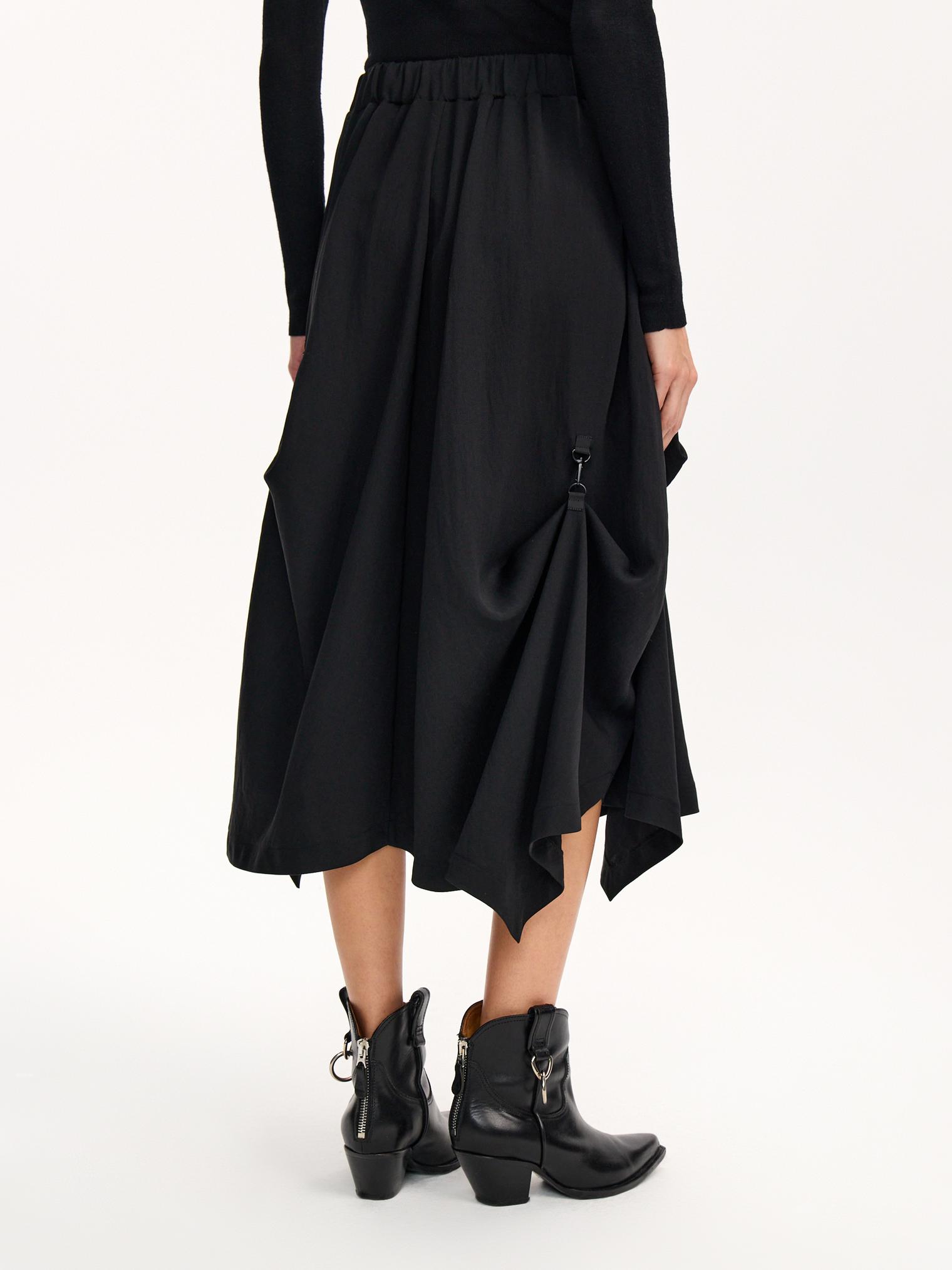 Юбка-трансформер на эластичной талии понравится тем, кто любит оригинальный крой и комфортную посадку. Модель из мягкого тенселя с подолом асимметричной длины. Меняйте длину и степень сборки, перемещая застежки карабинов. Она станет акцентным элементом образа.