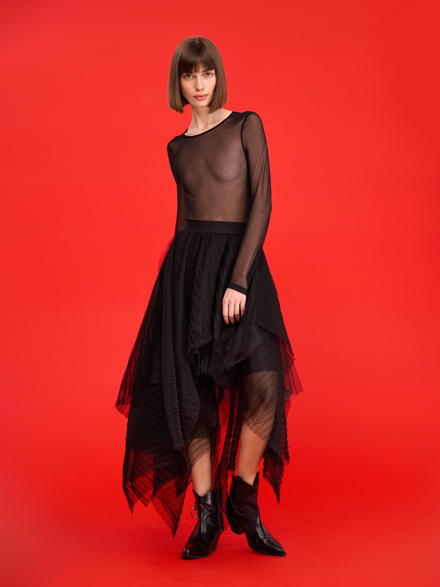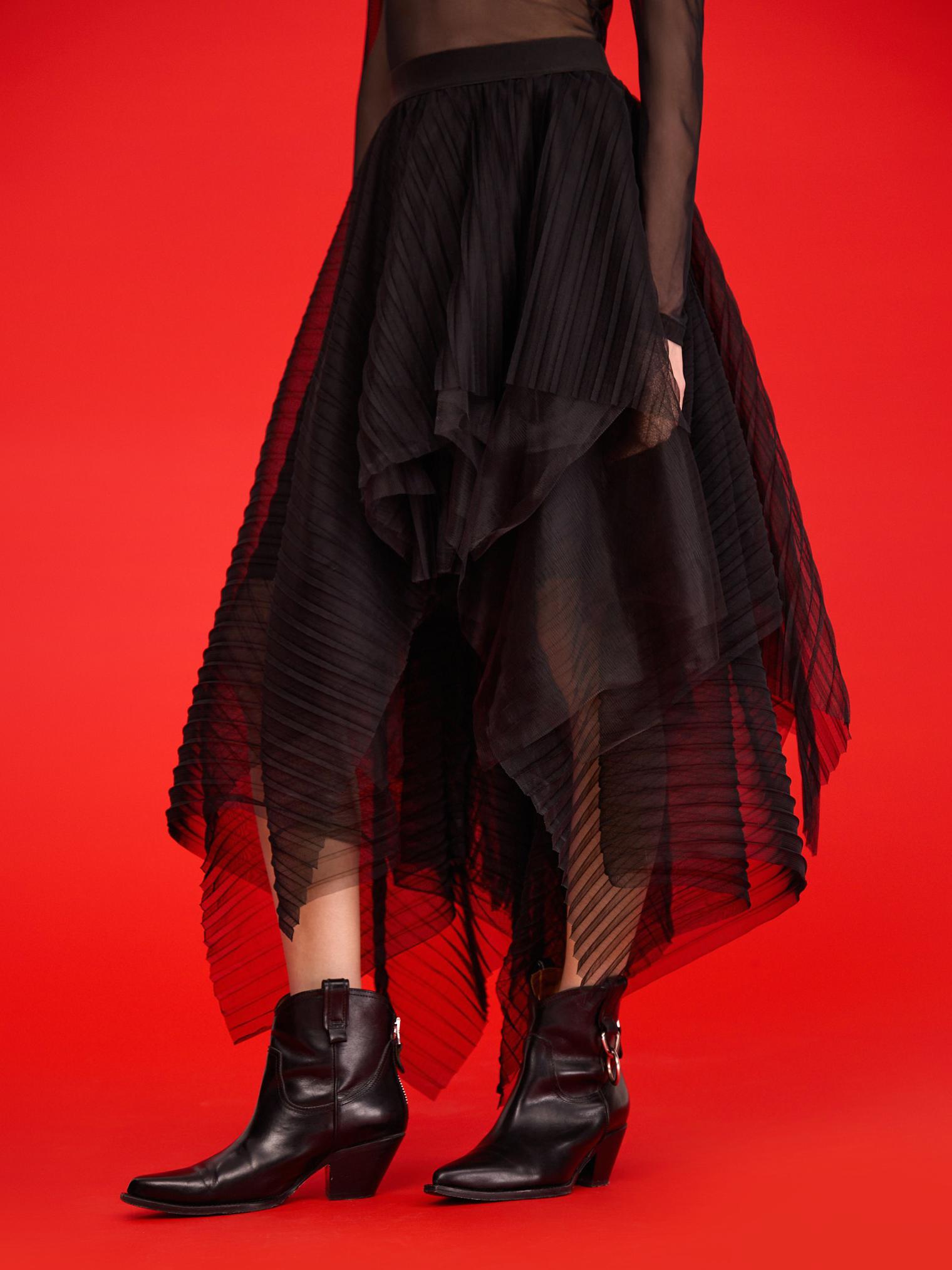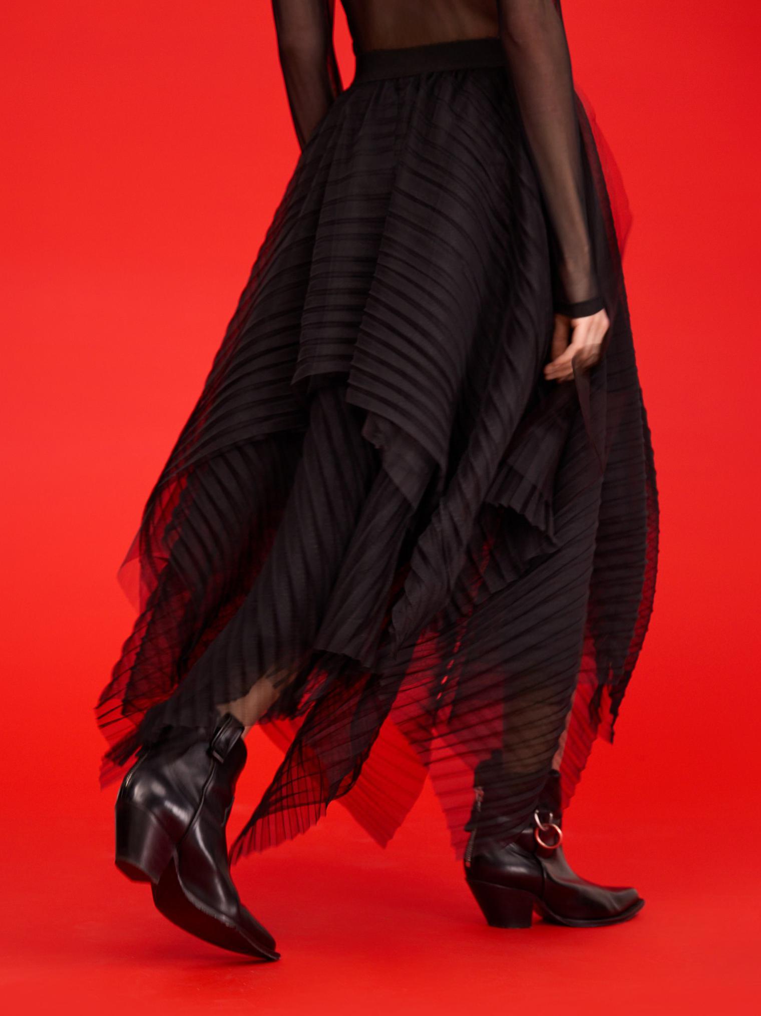 Юбка из новогодней капсулы – сама нежность и невесомость. Многослойность, асимметрия и плиссировка делают силуэт еще более воздушным. Идеально для вечерних выходов.