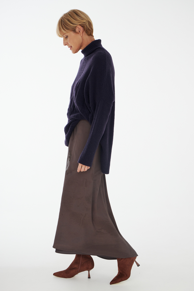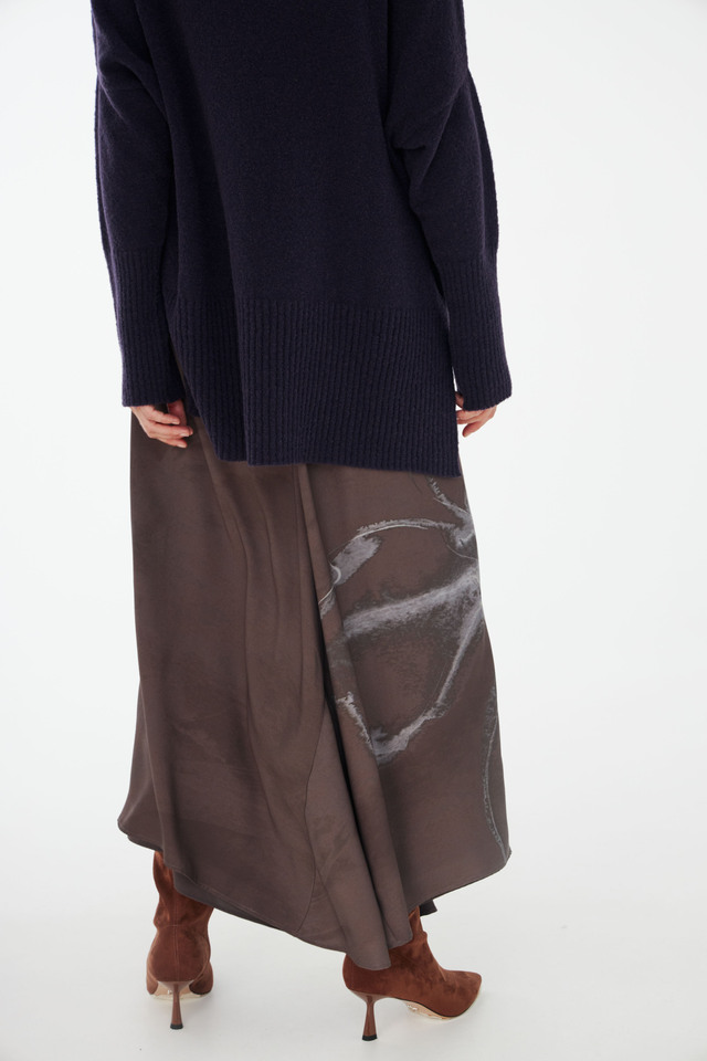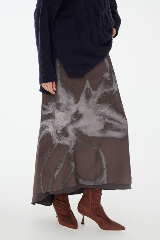 Юбка выполнена из мягкой и приятной на ощупь вискозной ткани. Юбка со шлейфом - изысканный предмет женского гардероба, который делает образ неповторимым. Она сочетает в себе классическую элегантность и современные тенденции моды, подчёркивая красоту и изящество женской фигуры. Особый шарм придает изделию принт в виде крупного цветка, как воплощение нежности и женственности. Безусловную изысканность подчеркивают серые оттенки.