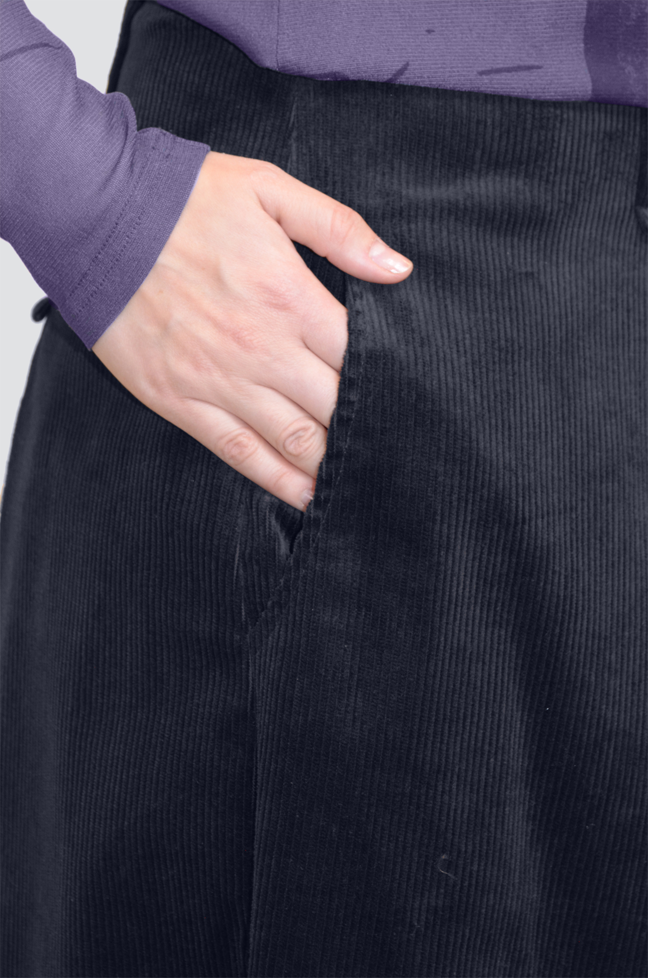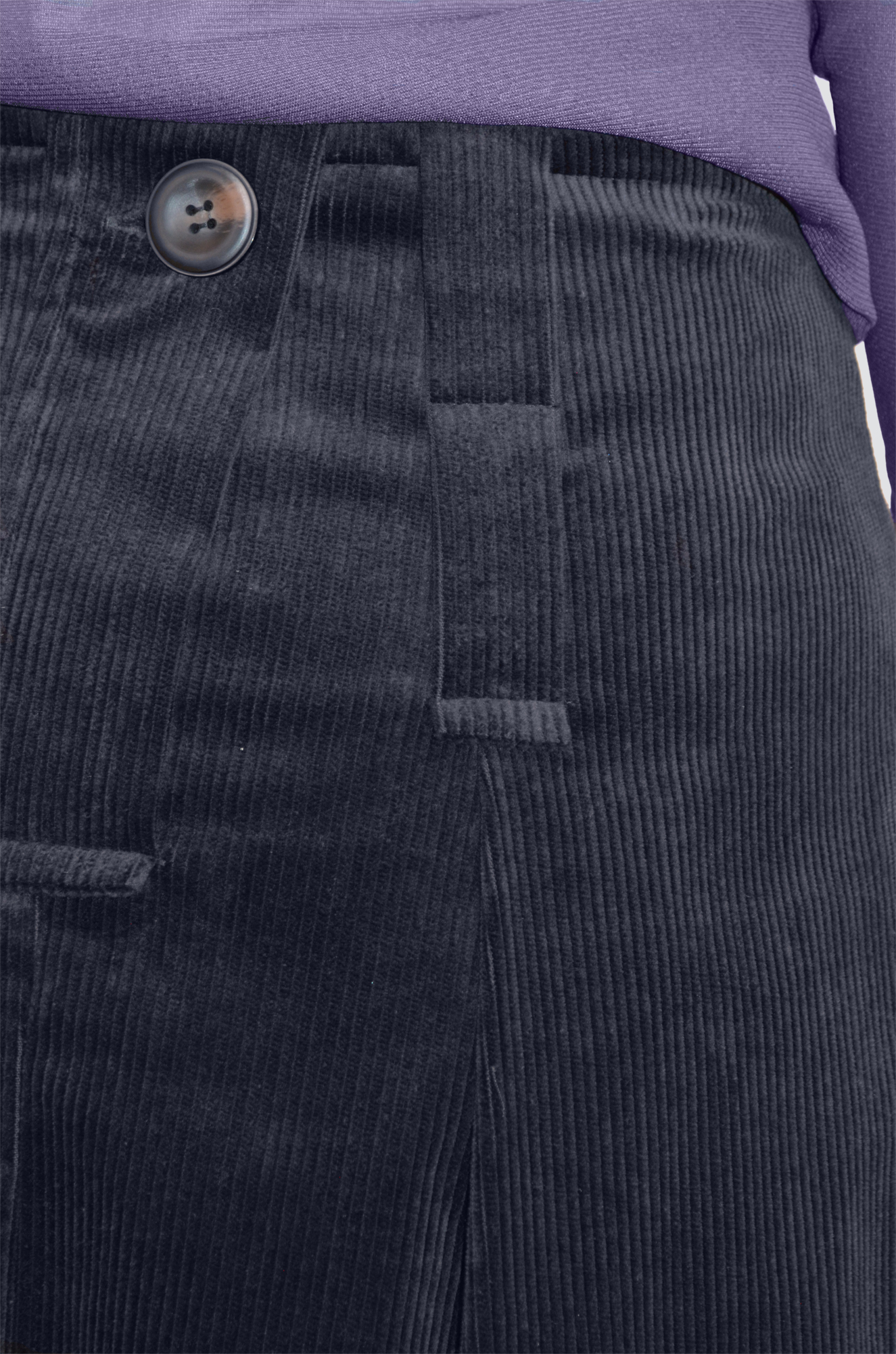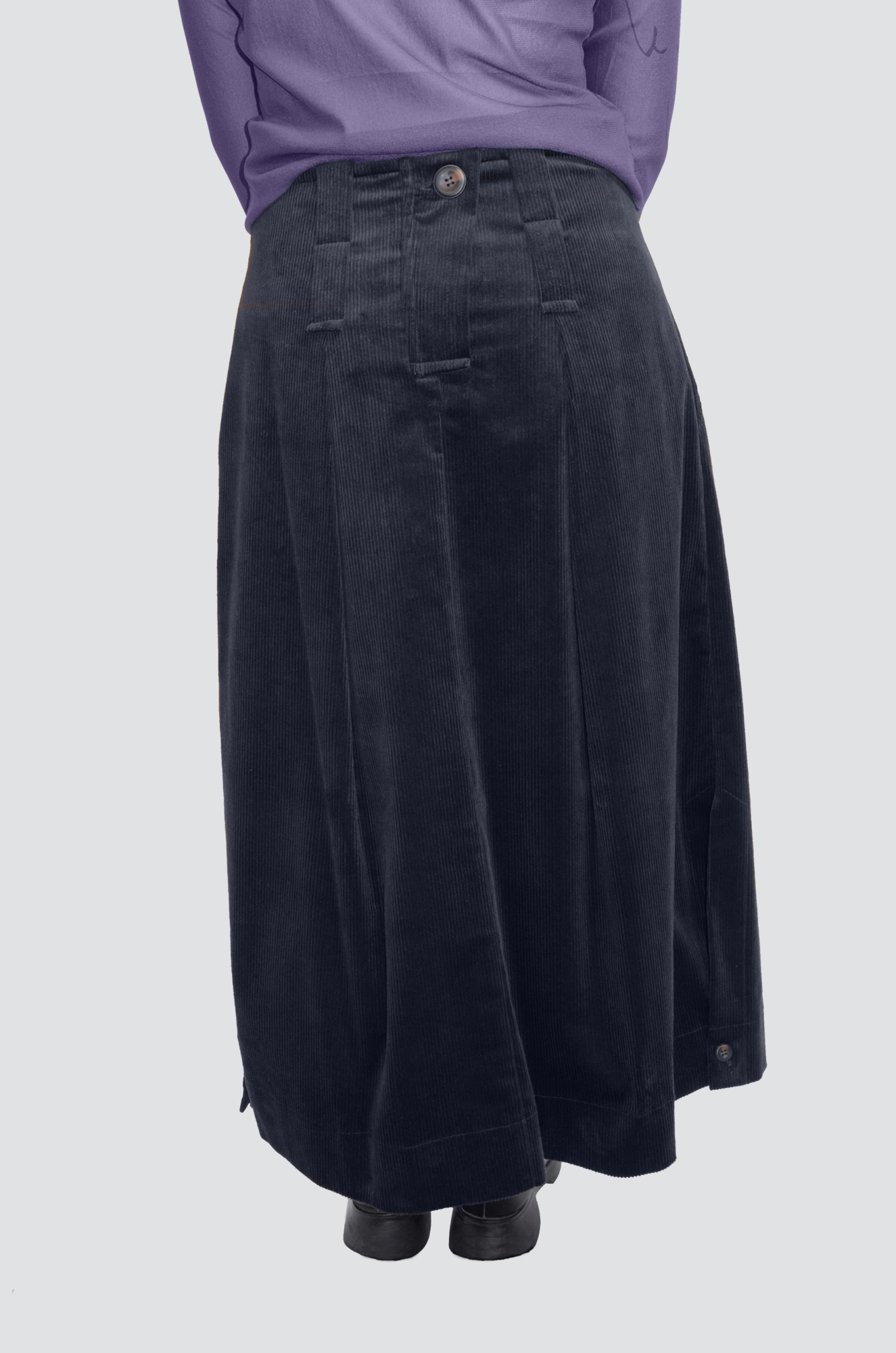 Юбка А-силуэта на обтачке, заднее полотнище переходит на полочку в рельефные швы с разрезами. В рельефных швах карманы, переднее полотнище с декоративной складкой, завязывающейся на завязки.