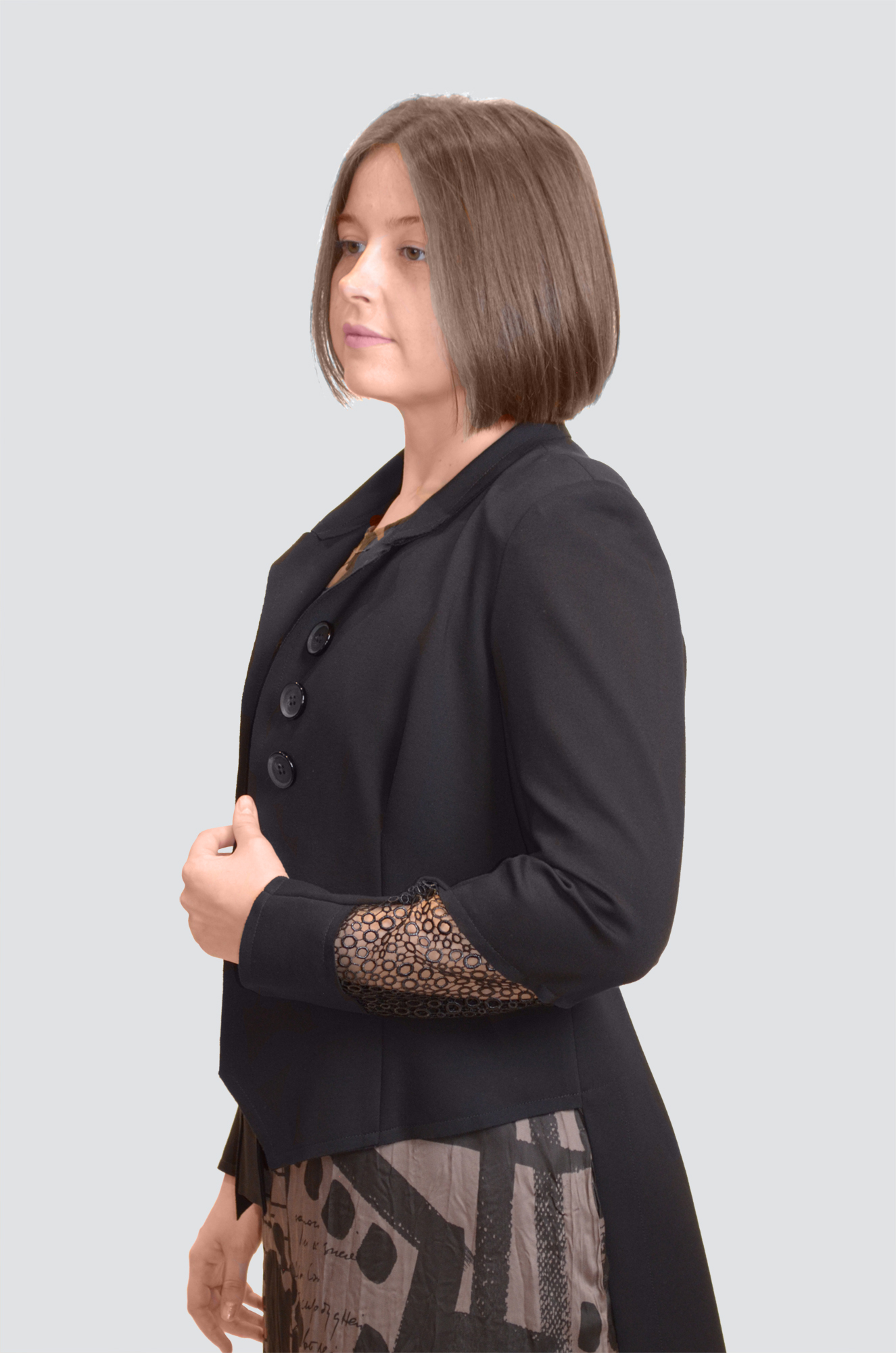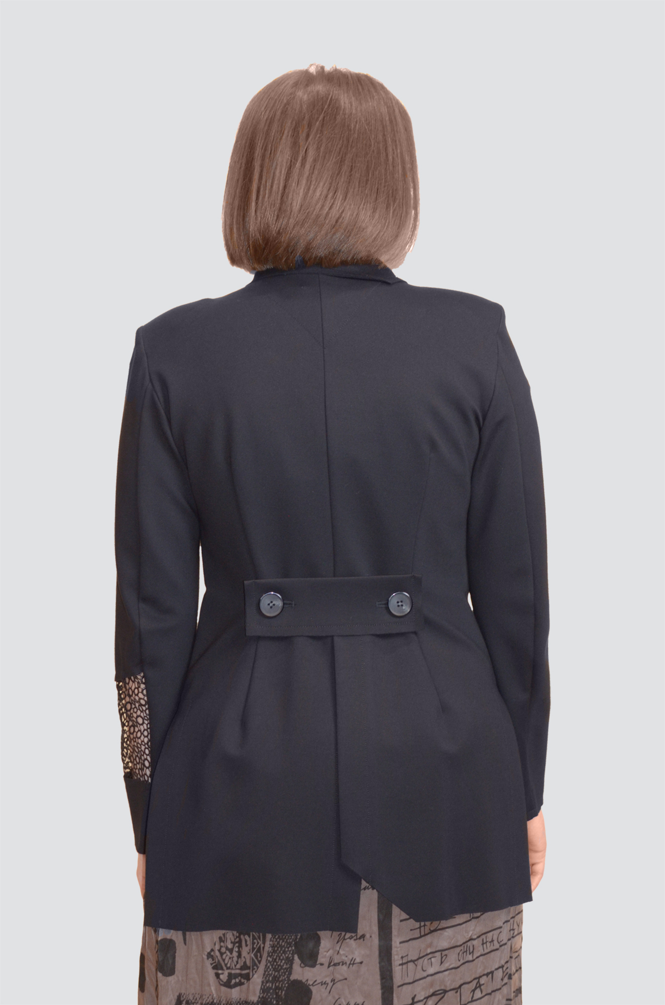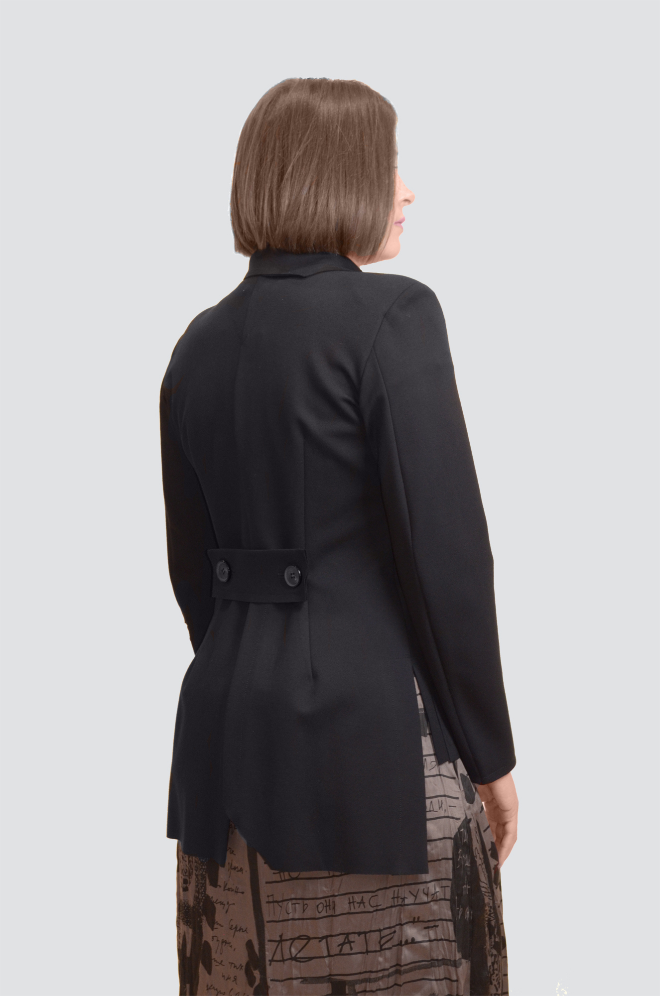 Жакет-фрак полуприталенный с втачными рукавами, фигурным воротником, с открытыми срезами, накладным карманом, с отделочной деталью по рукаву, с хлястиком и шлицей на спинке.