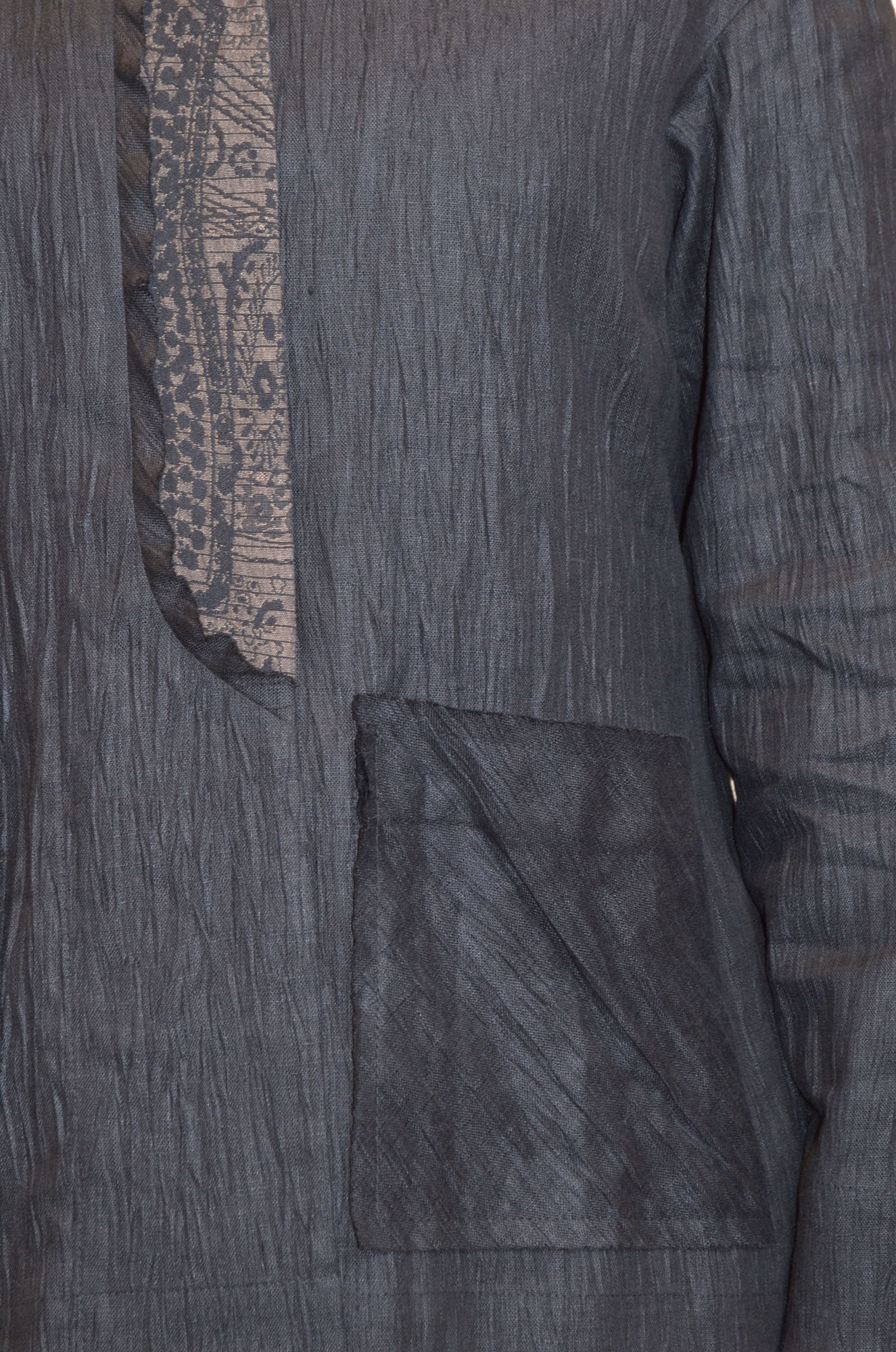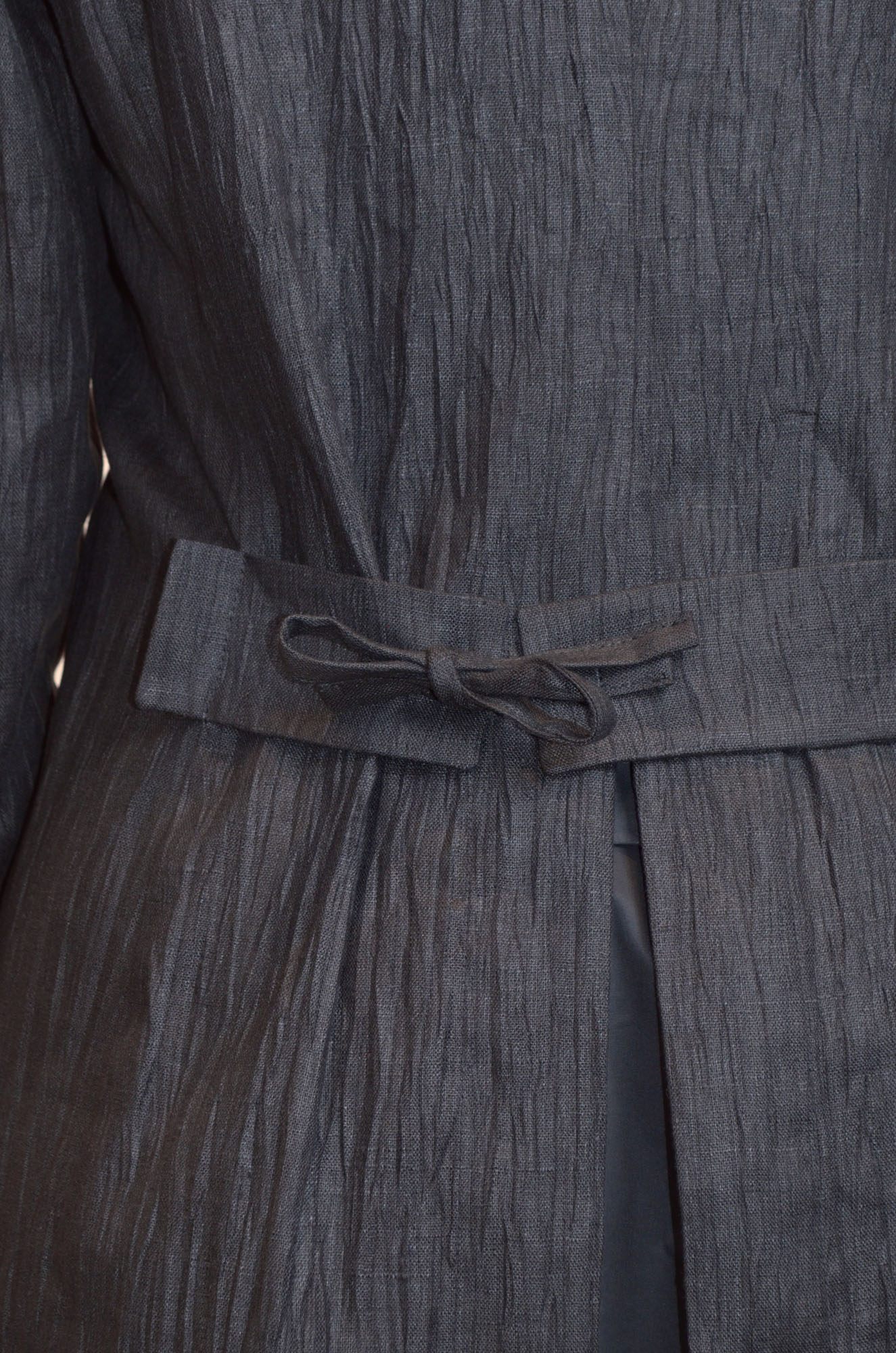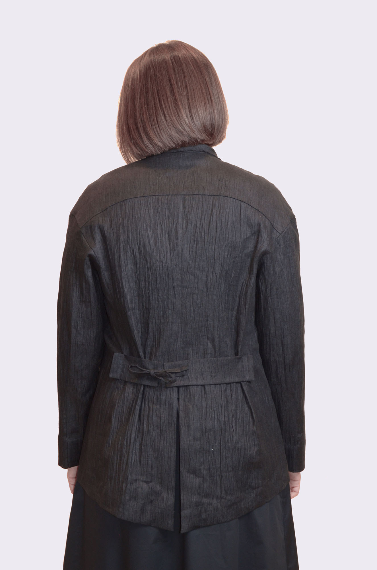 Жакет без подкладки со спущенной линия плеча, воротником-стойка, супатной застежкой из отделочной ткани, фигурная спинка с рельефами, кокеткой и разрезом в среднем шве, накладными карманами, притачным поясом.