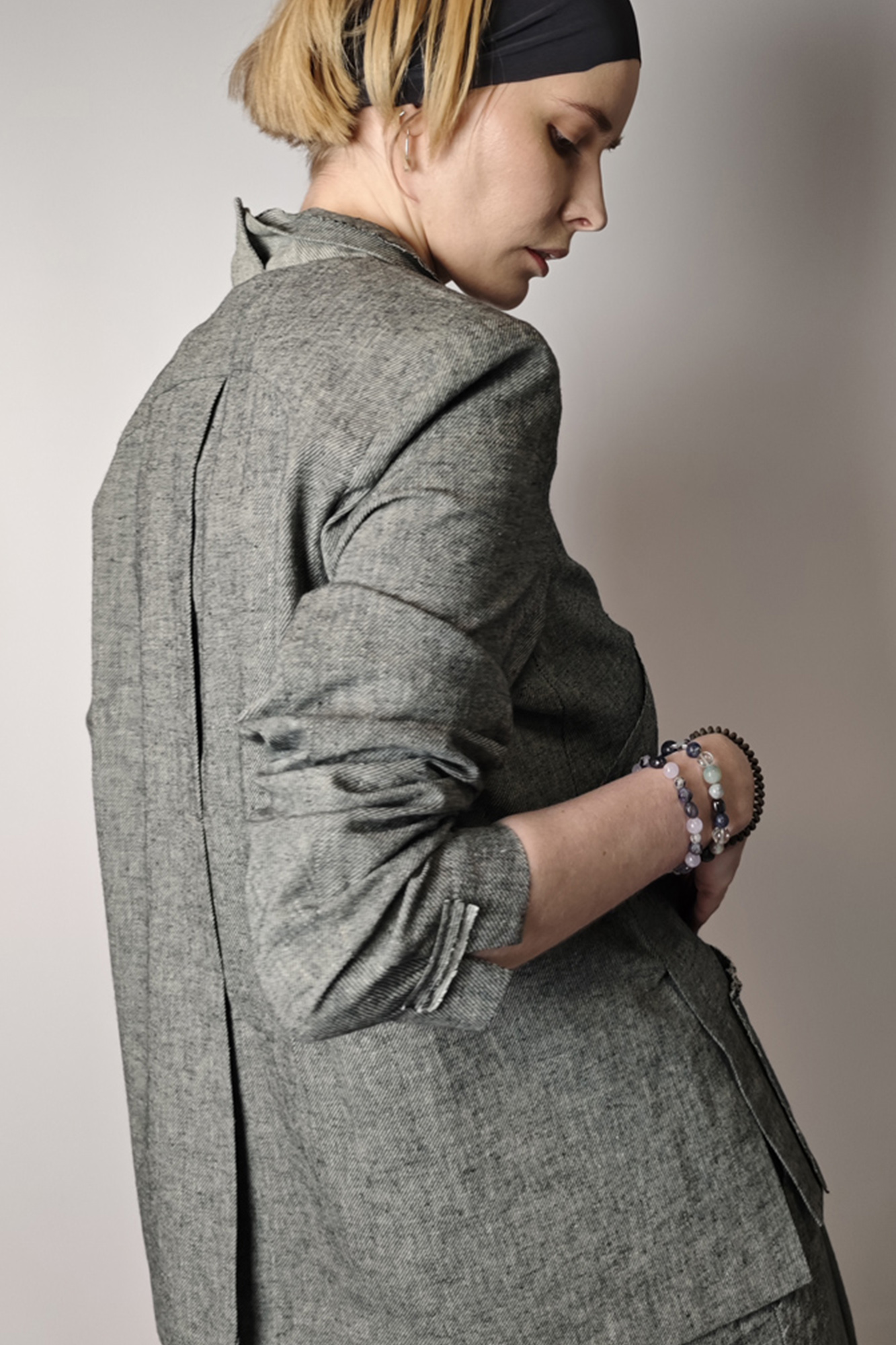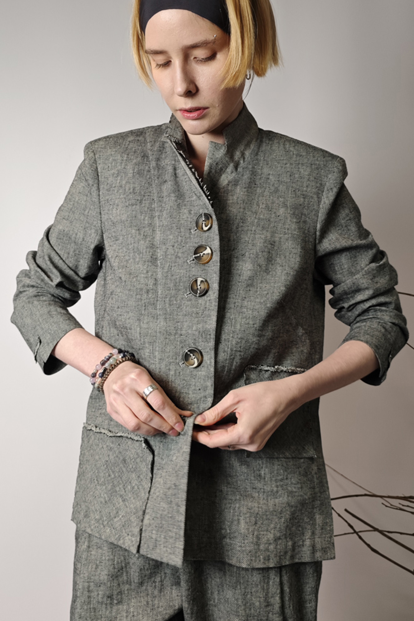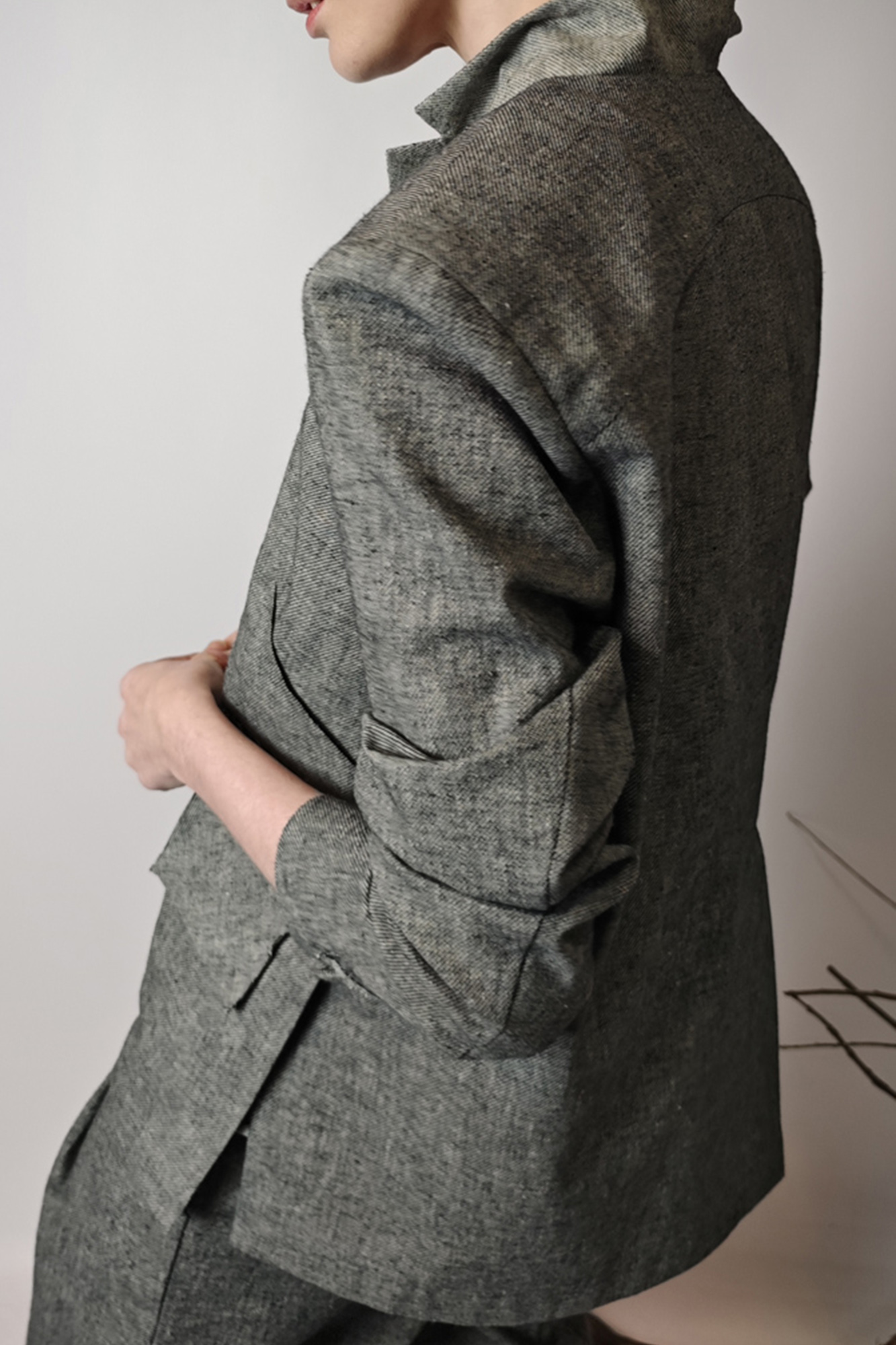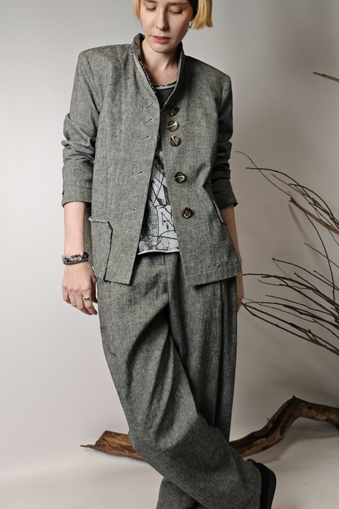 Жакет из фактурной ткани в сложном сером меланже — стильная модель с мягким характером и выразительными деталями. Прямой, слегка свободный силуэт красиво смотрится в движении и легко вписывается как в повседневные, так и в более собранные образы.