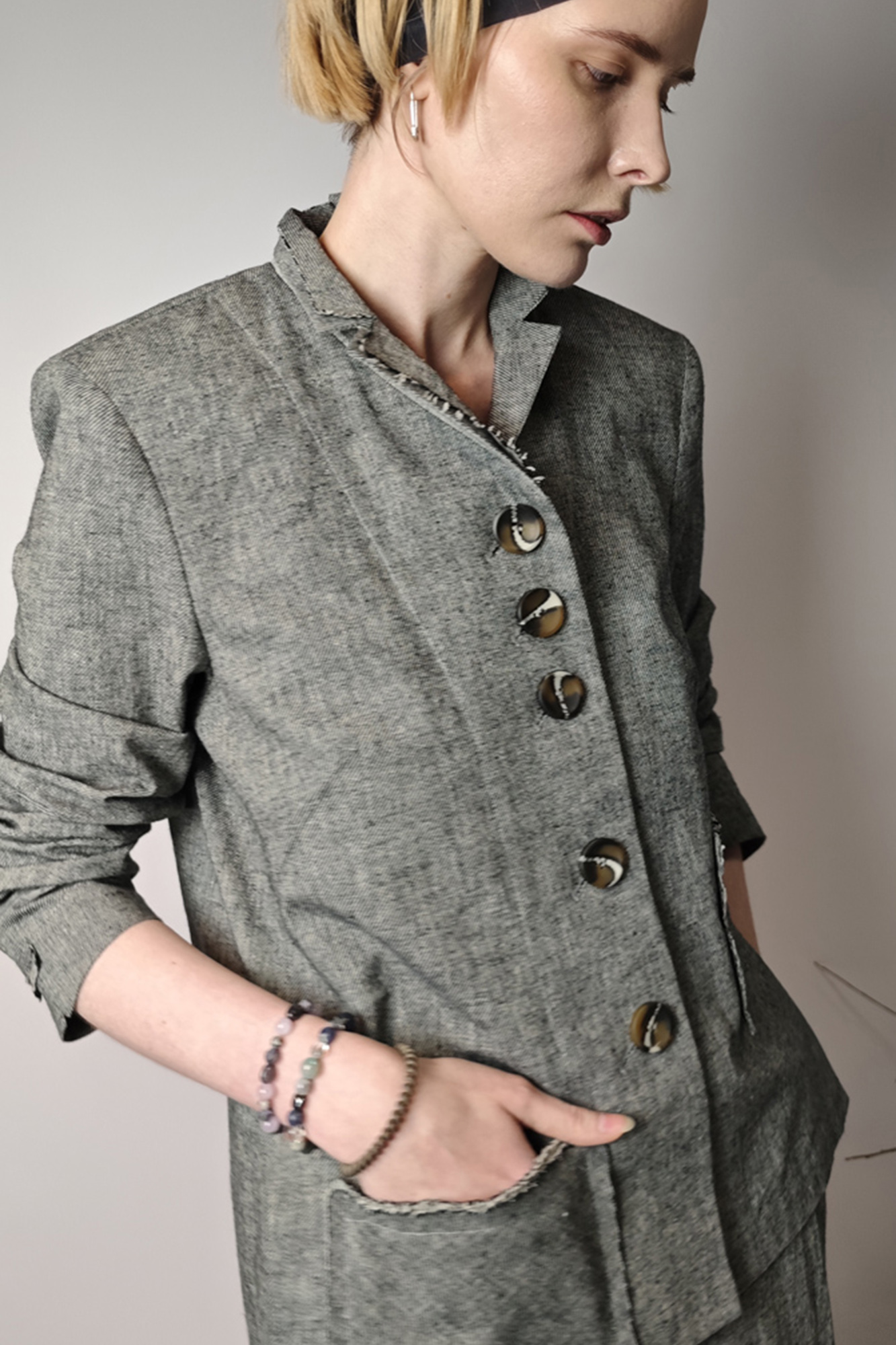 Крупные пуговицы, декоративно обработанные края и накладные карманы придают жакету современное дизайнерское звучание.
