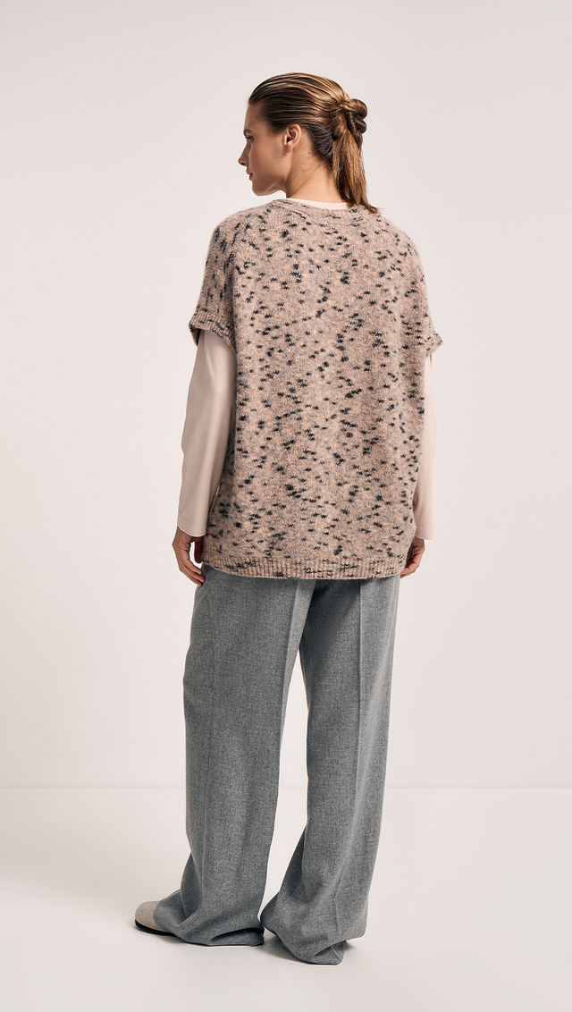 Жилет из премиальной итальянской пряжи с объемным прямым силуэтом и спущенном плечом, выполненный в основном переплетении "кулирная гладь". Благодаря особой технологии окрашивания пряжи создается эффект пятнистого узора, а сочетание шерсти и мохера обеспечивает износостойкость и долговечность.